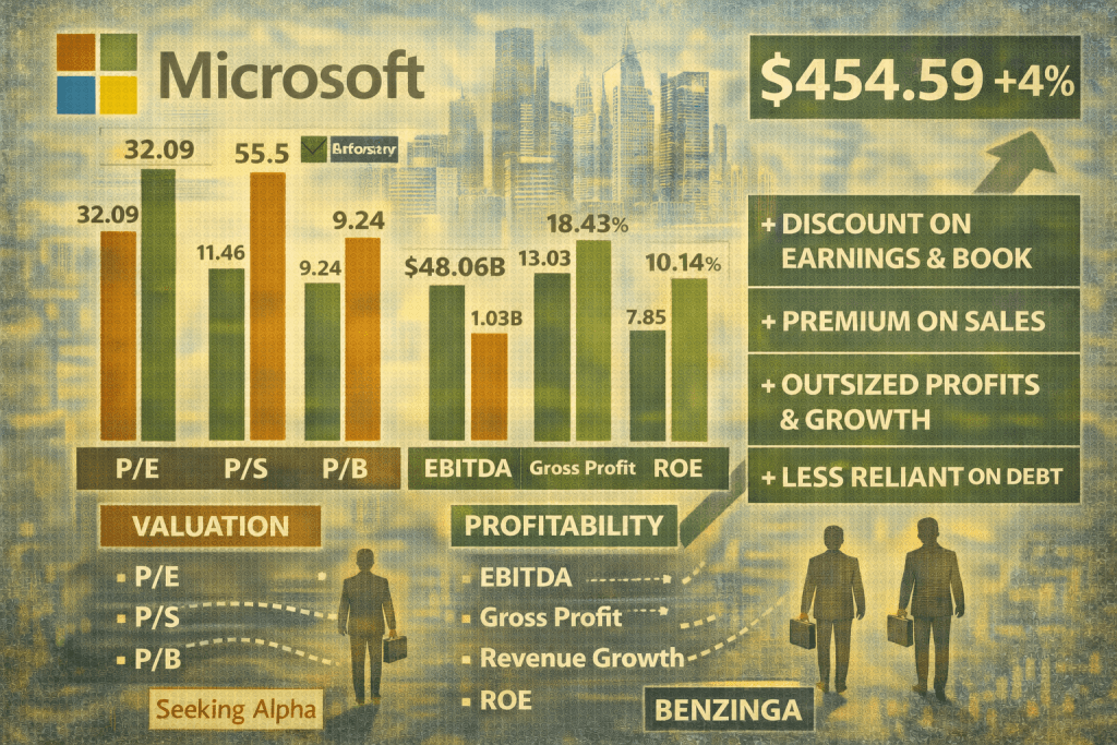 Benzinga’s data shows Microsoft trading at a discount on earnings and book, a premium on sales, and delivering above-average growth with strong profit scale and low leverage.